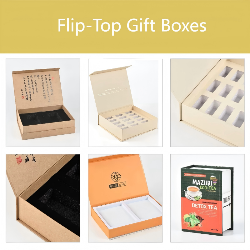 Flip-top gift boxes are premium rigid boxes with a hinged lid,Perfect for luxury products and gift packaging.