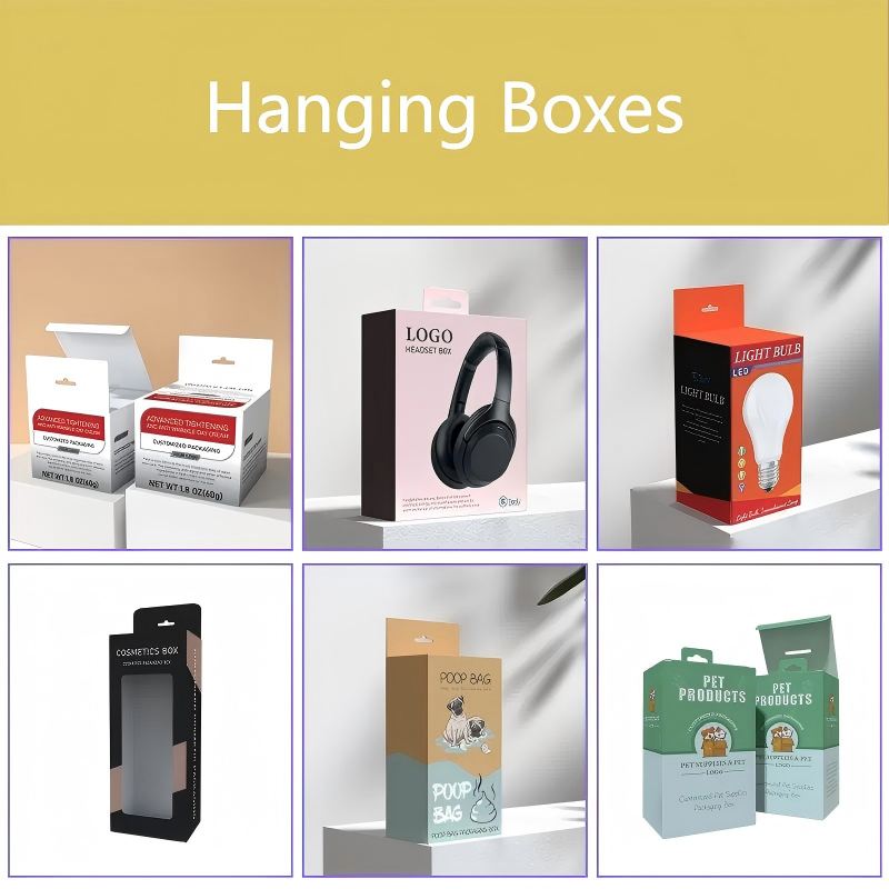 Hanging boxes feature a built-in peg or hole for retail display, combining convenient hanging with protective packaging, ideal for small consumer goods and retail products.